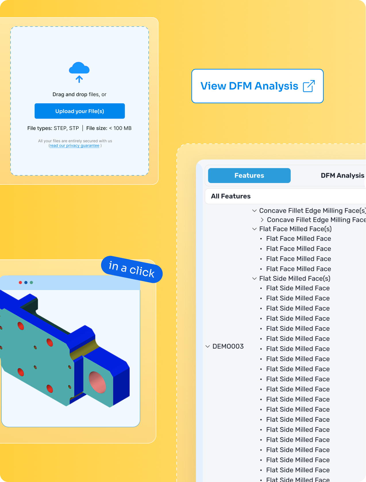 Upload your CAD file and get real-time, actionable design feedback to optimize parts for manufacturability, reduce errors, and cut costs before production begins.